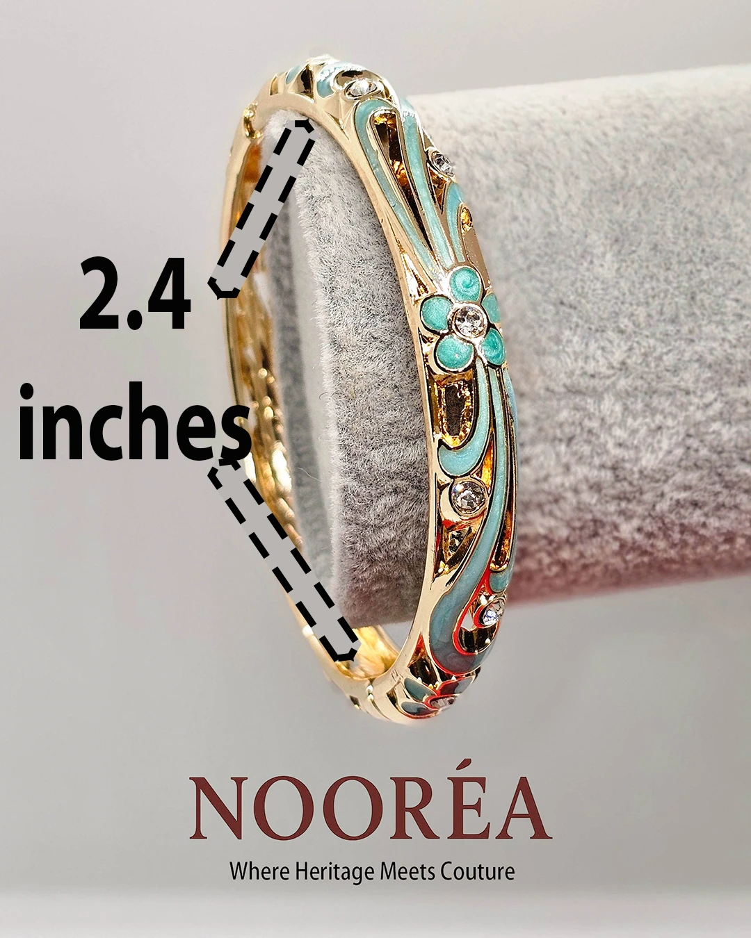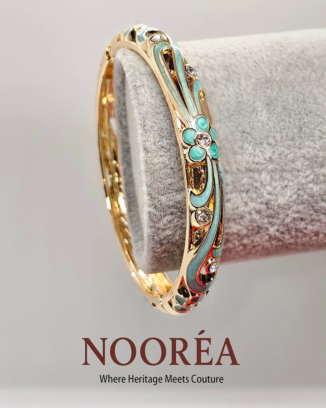 The Nooréa Aqua Filigree Grace combines delicate filigree patterns with refreshing aqua enamel tones. Its free-size open cuff (2.4 inches) ensures both comfort and sophistication, making it a standout piece for refined styling.