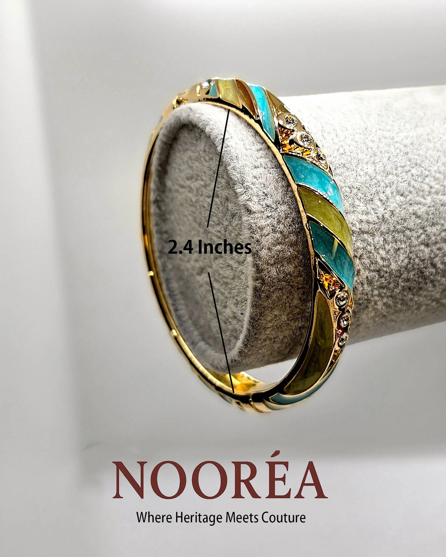 The Aqua Whisper bangle radiates calm with its turquoise blue enamel and gold detailing. Made in 2.4-inch free size with an openable side, it’s a perfect blend of serenity and style.