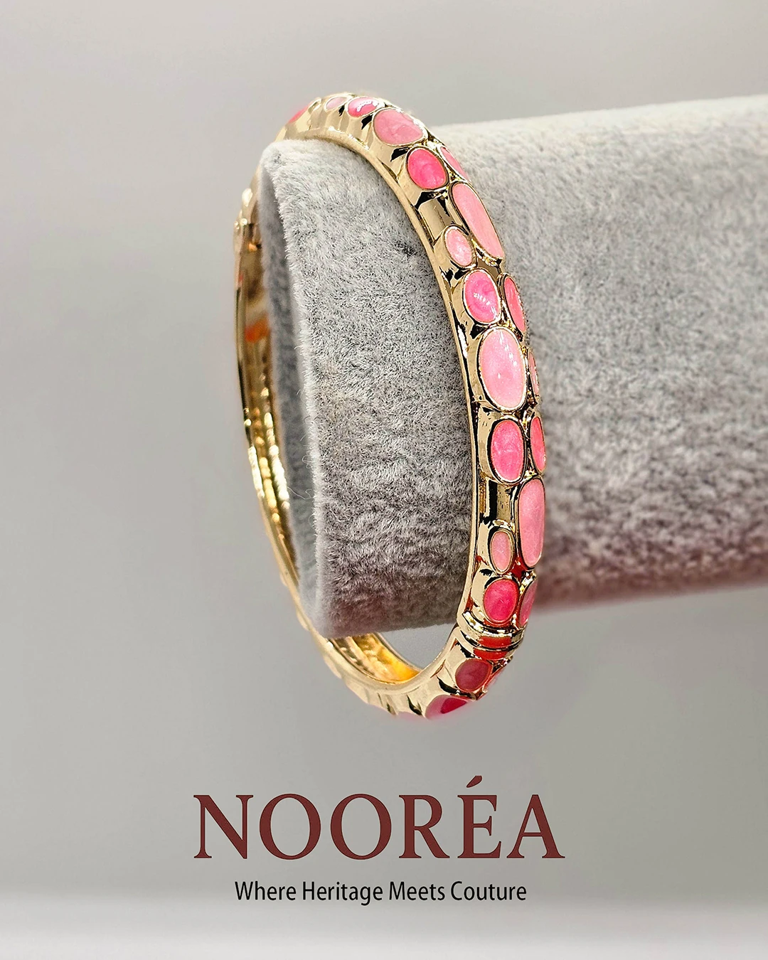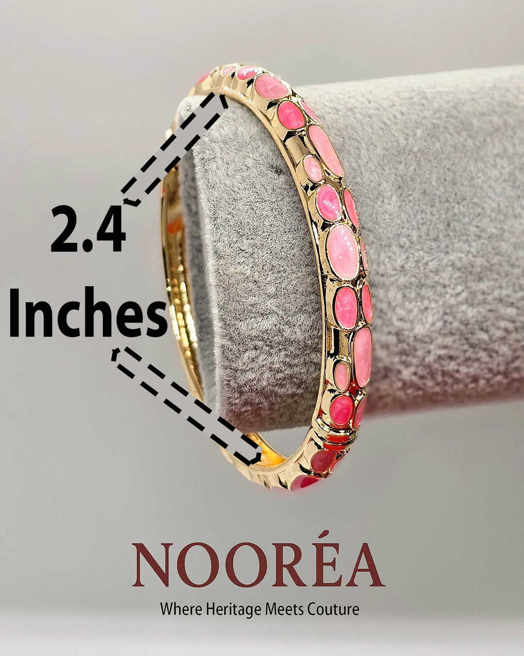 Bright and feminine, the Nooréa Coral Charm Cuff features coral enamel detailing framed by smooth gold tones. Its openable free-size design (2.4 inches) ensures ease, style, and long-lasting comfort.