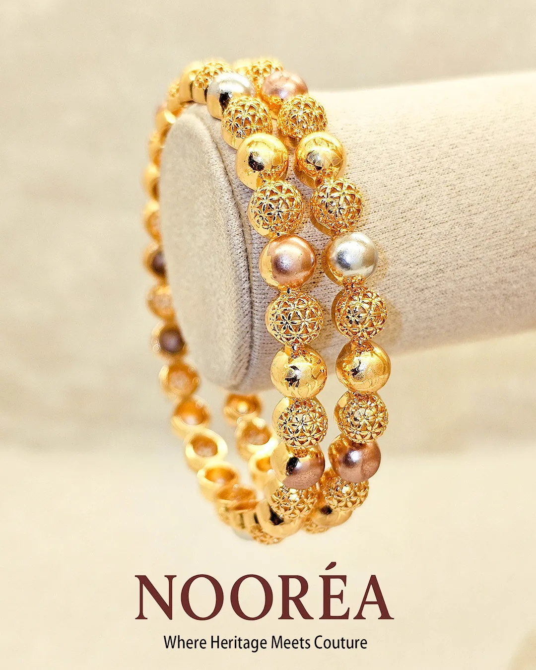 The Golden Bead Harmony Bangle highlights a rhythmic arrangement of polished bead accents that reflect light beautifully. Its versatile design allows you to style it solo or stack it for a bolder look. Ideal for festive gatherings and formal occasions.