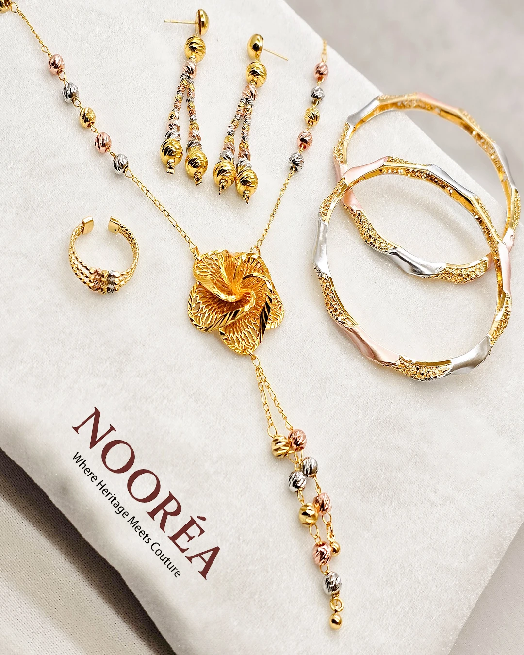 A complete 4-piece golden set featuring a rose-motif lariat, matching earrings, and bangles.
