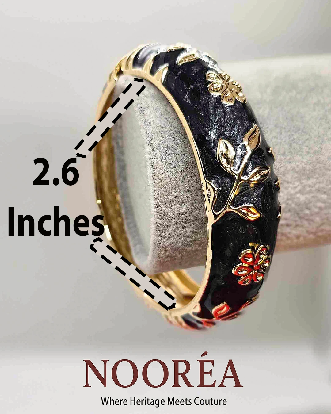 Elegant and expressive, the Noorea Midnight Bloom Heritage Cuff is crafted with deep black enamel and delicate floral motifs that reflect timeless artistry. This 2.6-inch free-size open bangle offers comfort and sophistication, making it ideal for evening wear, festive looks, or statement styling with traditional attire.