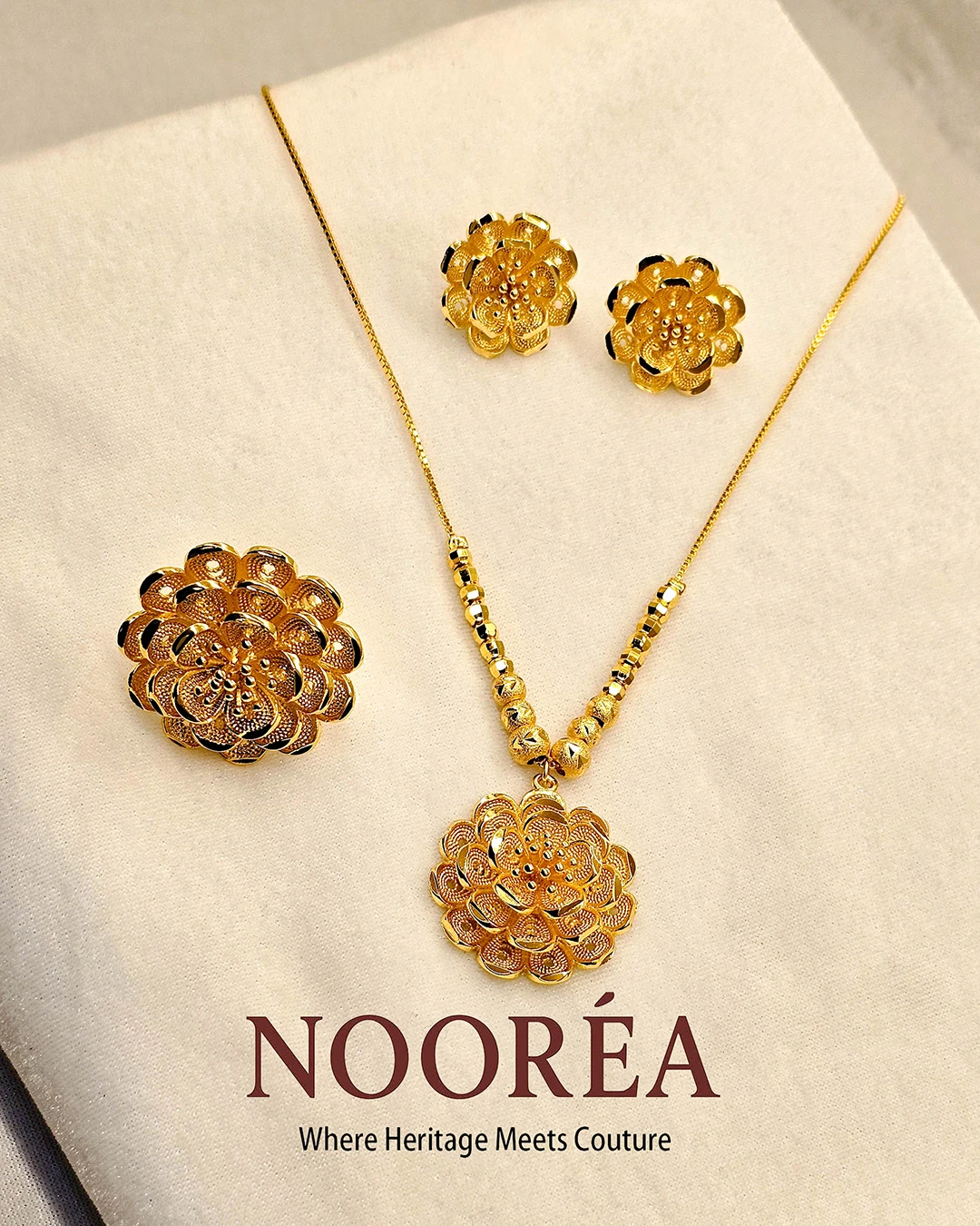 Pushpika highlights a beautifully detailed floral pendant paired with matching studs. The intricate craftsmanship and balanced design make it ideal for everyday elegance or light festive wear.