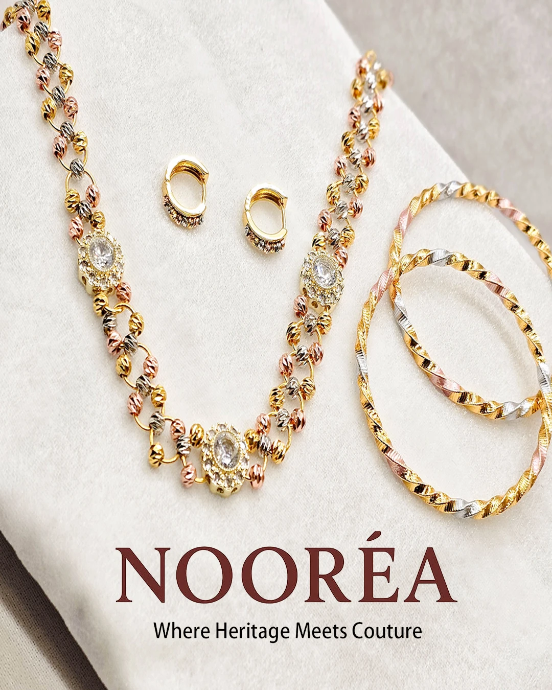 A vibrant, multi-tonal gold-finish set with intricate beadwork and matching bangles.