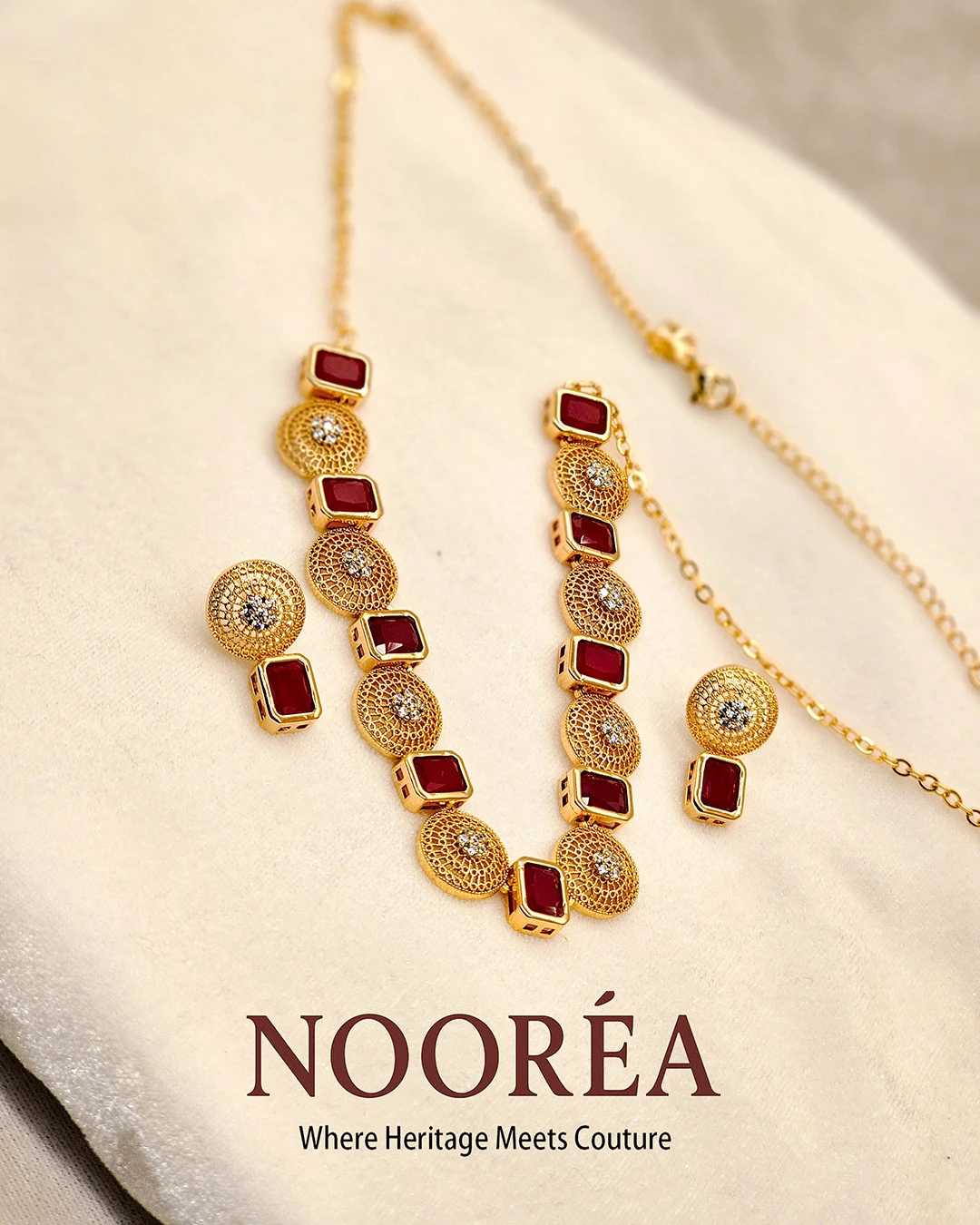Raktima features deep ruby-toned stones set within a sleek gold-finish chain. The design is elegant and versatile, suitable for weddings, festive gatherings, and evening wear.