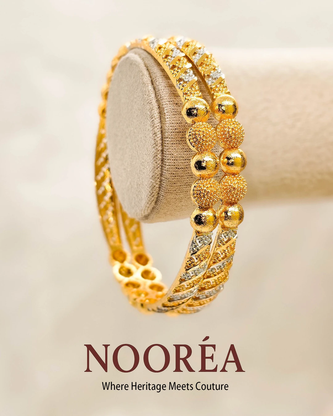 The Rameen Beaded Heritage Bangle is designed with prominent bead elements that enhance its visual appeal. Its structured form and polished gold tone make it perfect for celebrations and cultural events. A striking piece that still feels elegant and balanced.