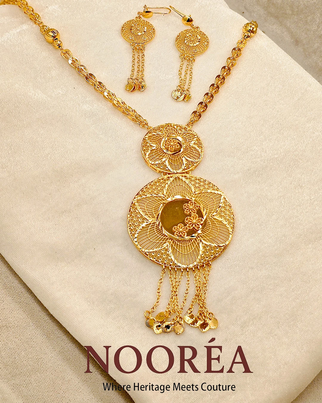 The Royal Empress Medallion Set features a beautifully crafted dual-layer pendant with intricate detailing and delicate hanging charms. Designed for women who love statement jewelry, this piece blends tradition with confidence. Perfect for weddings, formal gatherings, and festive occasions where you want to stand out with grace.
