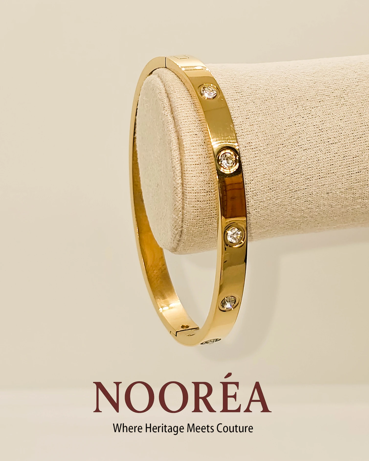 Elegant and lightweight, this bracelet features delicate crystal studs arranged on a sleek gold body. A perfect everyday luxury piece.