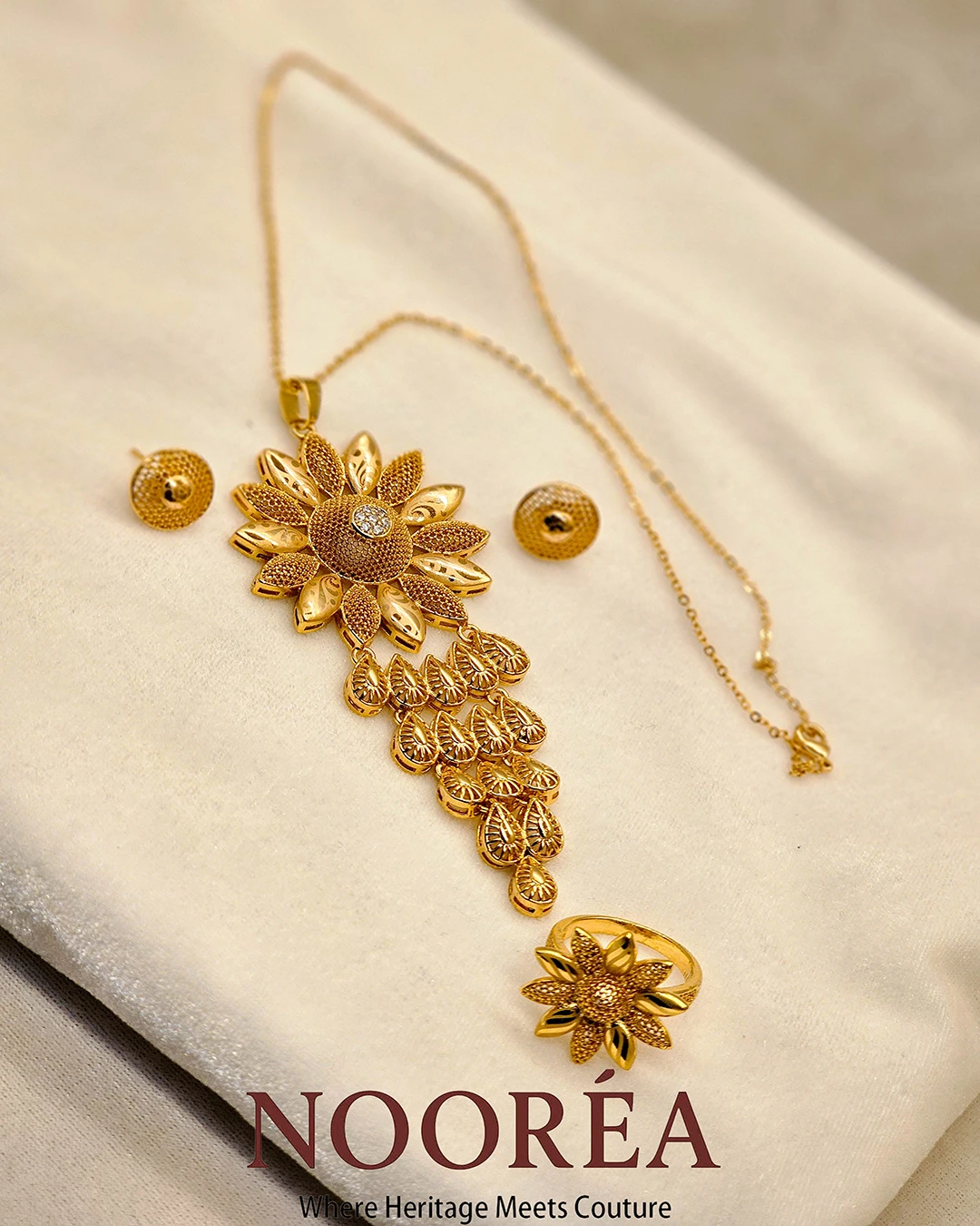 Surabhi features an elongated floral design that flows beautifully along the neckline. Crafted for traditional outfits like sarees and lehengas, this piece adds elegance without appearing heavy.