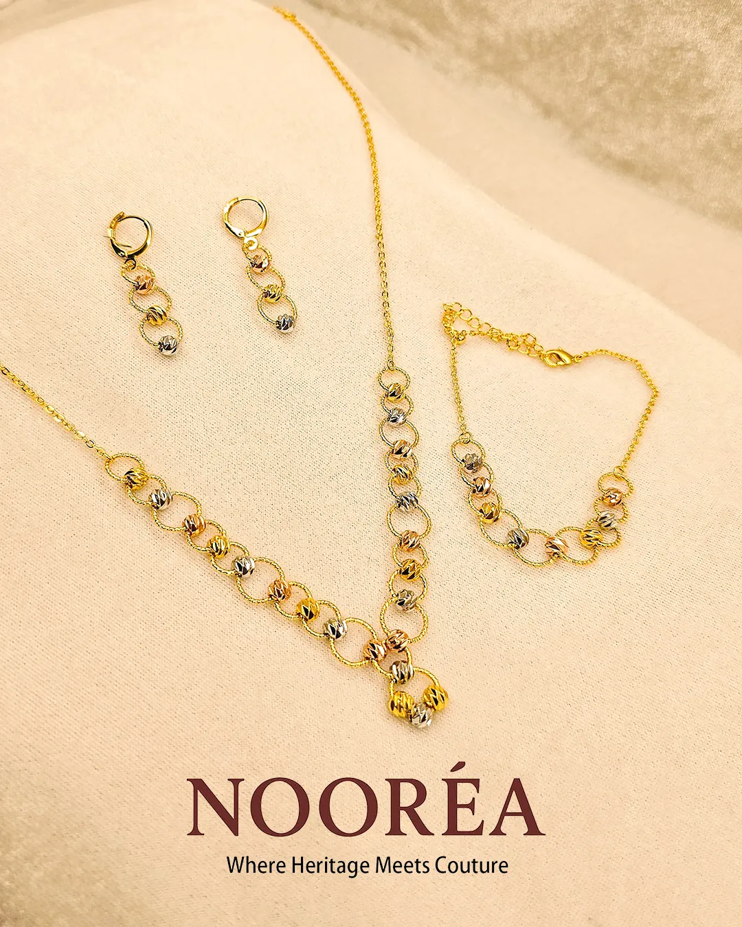 This comprehensive set celebrates variety with textured beads in yellow, white, and rose gold tones. The necklace and bracelet feature interlocking golden hoops that cradle the tri-color beads, creating a rhythmic and modern aesthetic. Paired with matching triple-drop earrings, this set is perfect for those who love to mix metals. The necklace features an 18-inch chain and comes with a 1-year color guarantee.